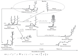 This study describes the biomorphology of plants living under variable watering conditions. Its outcome expands the concept of a modular organization as a constructive and representative approach to comparative-morphological analysis and unraveling the ways of biomorph evolution. The structural organization of biomorphs growing in sites composed of gradients of humidification stability (from floodplain meadows to coasts, water cuts, and beaches) is examined on a base of systemic and complementary approaches. Model plant species—Solanum ulcamara, Thalictrum simplex, Lysimachia vulgaris, Lycopus europaeus, Stellaria palustris Persicaria amphibia, and Erysimum cheiranthoides—are studied. It is determined that acceleration in the vegetative and generative spheres entails the appearance of monocarps in the hygrophilic evolutional line. It is shown that the ontogenesis of individuals of seed and vegetative origin is reduced to a single fruiting, and the specificity of the shoot-formation model is preserved in plants of all the considered biotopes. Such a specific sign is identified as the internode elongation in the shoots located in the substrate, in the supersubstrate parts under flooding, in grass rags, or in dense grass under low light. Another sign is a sympodial growth by formation of the replacement shoots. On the model species, it is determined that plant adaptability is supported by the changes in individual structural elements of the monocarpic shoots; the structural and functional zonation of the monocarpic shoots determines the autonomization of the individual’s parts. Our results confirm the idea that the monocarpic shoot and the system formed on its basis belong to the category of axes of an herbaceous plant as part of an architectural unit (in terms of D. Barthelemy and Y. Caraglio). Our data make it possible to conclude that reservoir settlement with flowering plants is possible for long-shoot long-rhizome grasses and subshrub vines. Two evolutional directions are possible: (1) the emergence of monocarpic annuals and (2) the emergence of short-lived and annual plants of vegetative origin associated with the formation of acentric and clearly polycentric stolon-forming and root-shoot biomorphs.