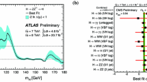 The input scheme for decay widths and branching ratios is not affected by the extension to include LHC results in HiggsBounds-4, and the calculation from the effective couplings follows what has been published earlier [12, 13].Footnote 5 The only difference compared to previous versions is that we have updated the SM reference values to agree with those recommended by the LHC Higgs cross section working group [33–35] for \(M_H\) between \(80\,\, \mathrm {GeV}\) and \(1\,\, \mathrm {TeV}\).