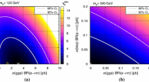 Where a SM equivalent exists, the reference cross section \(\sigma _\mathrm{ref} (P)\) for Higgs boson \(h_k\) is \(\sigma _\mathrm{ref} (P)=\sigma _\mathrm{SM} (P)\), evaluated for \(M^\mathrm{SM}_H=M_{h_k}\). The only neutral Higgs production process considered in HiggsBounds up to now which does not have a SM equivalent is \(e^+e^- \rightarrow h_j h_i\). In this case, we choose as the reference cross section a fictitious production process for two scalar particles (\(H'\), \(H\)) with masses \(M_{H'}=M_{h_j}\) and \(M_H = M_{h_i}\) that proceeds via a virtual \(Z\) exchange with a standardized squared coupling constant \(g_{H'HZ}^2 =e^2/(4 s_\mathrm {w}^2 c_\mathrm {w}^2)\), where \(e\) denotes the electromagnetic coupling constant, and \(s_\mathrm {w}\) (\(c_\mathrm {w}\)) the sine (cosine) of the weak mixing angle, respectively.Footnote 4 Similarly, for the process \(P=e^+e^- \rightarrow H^+_j H^-_j\), the reference cross section is the cross section of the process \(e^+e^- \rightarrow H^+ H^-\) in a two-Higgs-doublet model (e.g. the MSSM) at tree-level (i.e. with \(s\)-channel \(\gamma \) and \(Z\) exchange). This reference cross section depends solely on the mass of the charged Higgs boson and SM quantities. As a consequence, the leading-order prediction in the MSSM is \(R_{\sigma }(e^+e^- \rightarrow H^+_j H^-_j)=1\).