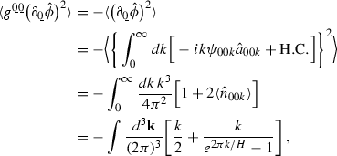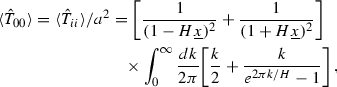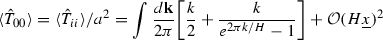 $$\begin{aligned} \delta T_{00}=\int \frac{{d\mathbf {k}}}{{2\pi }}\frac{{k}}{{2}}+\frac{{H^2}}{{24\pi }}\,;\qquad \delta T_{ii}/a^2=\int \frac{{d\mathbf {k}}}{{2\pi }}\frac{{k}}{{2}}-\frac{{H^2}}{{24\pi }}\,. \end{aligned}$$