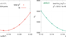 First, we have repeated the NNLO determination removing \(\alpha _s\) values that are farthest from the best-fit value \(\alpha _s\left( m_Z \right) =0.1185\), fitting a smaller range of values around the minimum. As a further consistency check, we have removed \(\alpha _s\) values asymmetrically. Results are shown in Table 4; in each case we show the number of discarded \(\alpha _s\) values \(N_\mathrm{trim}\), the resulting fitted range, the best fit \(\alpha _s\left( m_Z \right) \) and uncertainty, and the number of surviving c-replicas \(N_\mathrm{rep}\). Here too, the behaviour is consistent with expectations. As the fitted range is reduced, the experimental uncertainty increases and the number of surviving c-replicas decreases (thereby also increasing the finite-size uncertainty). The central value, however, is extremely stable; the shift in central value when restricting the range is always more than a factor two smaller than the experimental uncertainty. In fact, the shift is never larger than \(\Delta =0.00010~(0.08\%)\) unless the number of surviving c-replicas becomes of order ten, in which case the finite-size uncertainty (recall Table 2) is of the same order or larger.