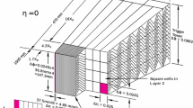 The solenoid is surrounded by a high-granularity lead/liquid-argon (LAr) sampling electromagnetic (EM) calorimeter with an accordion geometry. The EM calorimeter (EMC) measures the energy and the position of electromagnetic showers with \(|\eta |<3.2\). It is divided into a barrel section, covering the pseudorapidity region \(|\eta |<1.475\), and two endcap sections, covering the pseudorapidity regions \(1.375<|\eta |<3.2\). The transition region between the barrel and the endcaps, \(1.37 \le |\eta | < 1.52\), has a large amount of material upstream of the first active calorimeter layer and is not considered for the precision photon measurements reported in this paper. The EM calorimeter is composed, for \(|\eta |<2.5\), of three sampling layers, longitudinal in shower depth. The first layer has a thickness of about 4.4 radiation lengths (\(X_0\)) at \(\eta = 0\).Footnote 5 In the ranges \(|\eta |<1.4\) and \(1.5<|\eta |<2.4\), the first layer is segmented into high-granularity strips in the \(\eta \) direction, with a typical cell size of \(0.003 \times 0.0982\) in \(\Delta \eta \times \Delta \phi \) in the barrel. For \(1.4<|\eta |<1.5\) and \(2.4<|\eta |<2.5\) the \(\eta \) segmentation of the first layer is coarser, and the cell size is \(\Delta \eta \times \Delta \phi = 0.025 \times 0.0982\). The fine \(\eta \) granularity of the strips is sufficient to provide, for transverse momenta up to \({\mathcal {O}}(100\,\text {GeV})\), an event-by-event discrimination between single-photon showers and two overlapping showers originating from the decays of neutral hadrons, mostly \(\pi ^0\) and \(\eta \) mesons in jets, in the fiducial pseudorapidity region \(|\eta |<1.37\) or \(1.52 \le |\eta |<2.37\). The second layer has a thickness of about 16 \(X_0\) at \(\eta = 0\), and a granularity of \(0.025 \times 0.0245\) in \(\Delta \eta \times \Delta \phi \). It collects most of the energy deposited in the calorimeter by photon and electron showers. The third layer has a granularity of \(0.05 \times 0.0245\) in \(\Delta \eta \times \Delta \phi \) and a depth of about 2 \(X_0\) at \(\eta \) = 0. It is used to correct for leakage of high-energy showers into material beyond the EM calorimeter. In front of the accordion calorimeter, a thin presampler (PS) layer, covering the pseudorapidity interval \(|\eta |<1.8\), is used to correct for energy loss upstream of the calorimeter. The PS consists of an active LAr layer with a thickness of 1.1 cm (0.5 cm) in the barrel (endcap) and has a granularity of \(\Delta \eta \times \Delta \phi \) = \(0.025 \times 0.0982\). The material upstream of the PS has a thickness of about 2 \(X_0\) for \(|\eta |<0.6\). In the region \(0.6<|\eta |<0.8\) this thickness increases linearly from 2 \(X_0\) to 3 \(X_0\). For \(0.8< |\eta | < 1.8\) the material thickness is about or slightly larger than 3 \(X_0\), with the exception of the transition region between the barrel and the endcaps and the region near \(|\eta | = 1.7\), where it reaches 5–6 \(X_0\). A sketch of a the EM calorimeter’s longitudinal and lateral segmentation around \(\eta = 0\) is shown in Fig. 1.