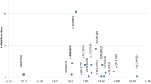 Because populations belonging to the same continental group exhibit similar patterns in allele enrichment/depletions, we decided to merge them to examine patterns at the continental level with benefits of larger sample sizes and simplification of pattern recognition. A heatmap (Fig. 3) visualizes how significantly the effect alleles were enriched or depleted in each continental group in comparison with the global average for a selected set of 39 obesity risk SNPs, which have enrichment or depletion p-values of at least 10−100 and have reached genome-wide significance (5 × 10−8) in GWA studies. The heatmap clearly shows that African and East Asian populations have the largest number of SNPs that exhibit the most significant allele frequency changes. In many cases, African and East Asian populations exhibit opposite directions in allele frequency changes – effect alleles were enriched in one population but depleted in the other. For example, SNP rs2030323, located in the intron of BDNF (brain derived neurotrophic factor) which encodes a member of the nerve growth factor family of proteins, has C/A alleles in which the C allele was tested in European [27] and East Asian [28] populations to increases obesity risks. The C allele has 77%, 51% and 95% frequencies in European, East Asian and African populations, respectively (Table 2). The allele frequency in Africans is almost twice of East Asians. In the Esan population in Nigeria (ESN), the C allele frequency has reached 99.5% (n = 99, Additional file 1: Table S1). In another contrasting example, rs7708584, approximately 27 kb upstream of GALNT10 (polypeptide N-acetylgalactosaminyltransferase 10) whose protein product functions in the synthesis of mucin-type oligosaccharides [29], has A/G alleles in which the A allele was shown to increase BMI in African populations [30]. The A allele has 96% and 26% frequencies in East Asian and African populations, respectively. The allele frequency in East Asians is more than three times of Africans. In particular, in the Japanese population (JPT), the A allele frequency has reached 99.0% (n = 104). rs671, an SNP located in the coding region of ALDH2 (aldehyde dehydrogenase 2) which encodes an enzyme of the major oxidative pathway of alcohol metabolism, is associated with BMI in East Asian population [31]. The BMI-increasing allele, G, has a frequency of 83% in East Asians while it is fixed (100%) in Europeans (n = 503). Thus, this SNP cannot be identified as an obesity-associated locus in the European population. rs29941 and rs7359397, two SNPs close to KCTD15 (potassium channel tetramerization domain containing 15) and SH2B1 (SH2B adaptor protein 1), respectively, were among the 39 SNPs (Table 2). KCTD15 inhibits neural crest formation during embryonic development [32], and SH2B1 encodes the Src homology 2B adaptor protein 1, a protein mediates activation of various kinases and may function in cytokine and growth factor receptor signaling [33, 34]. These two genes were also found to be related to obesity with risk allele frequencies differing substantially between populations [14]. For rs7359397, its risk allele frequency in American group (47%) is 34 times of African group (1.4%). These results demonstrate extreme cases of population differentiation in obesity risk allele frequencies.