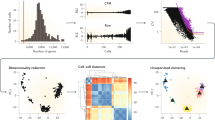 To test Seurat, we followed the guided clustering workflow recommended in the tutorial at [11] by first applying the recommended cell quality filtering based on the number of detected genes, minimum 200 per cell, and percentage of reads from mitochondrial genes. Then, as recommended by Seurat’s authors, we ‘regressed out’ uninteresting sources of variation such as technical noise and batch effects. As suggested in [12], regressing out these effects improves downstream dimensionality reduction and clustering. We then used Seurat’s MeanVarPlot() with its default values to identify genes that are outliers on the ‘mean variability plot’ as recommended by Seurat’s authors. After selecting highly variable genes and performing PCA analysis, we used Seurat’s DOKMeans() function which performs K-means clustering on both genes and cells; we refer to this method as Seurat in the Results section. We also used the FindClusters() function which uses the top principal components and identifies clusters of cells by a shared nearest neighbor (SNN) modularity optimization based clustering algorithm that first calculates k-nearest neighbors and constructs the SNN graph, then optimizes the modularity function to determine clusters; this method is referred to as Seurat_SNN.