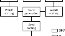 We first used the synthetic datasets described in “Performance comparison of multi-pass” subsection to compare the performance of the first stage of the two implementations, which is shown in Fig. 10. The performance of gpu-pairAlign implementation is much smaller than our implementation. The main reason is that when the size of the synthetic datasets is small, the resource on the GPU cannot be fully utilized for the inter-task parallelization model. The second reason is that the intermediate results are stored in integer arrays, which increases the size of shared memory of each block and the number of global memory accesses.