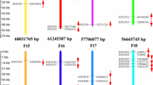 A total of 80 FtNAC genes were unevenly distributed on 8 chromosomes of Tartary buckwheat (Fig. 4). The largest, chromosome 1, had the most FtNAC genes (21, ~ 25.93%), followed by the smallest, chromosome 8 (11, ~ 13.58%) and chromosome 7 (10, ~ 12.35%), whereas there were only six genes in chromosome 5 (~ 1.31%) (Fig. 4). To identify the duplication events in FtNAC genes, a collinearity analysis was performed using MCScanX software. Fourteen pairs of fragment duplication genes were found in 80 FtNAC genes (Fig. 5). Fragment duplication genes were the most common on chromosome 1, followed by chromosome 3, whereas there were no fragment duplication gene pairs on chromosome 7 (Fig. 5).