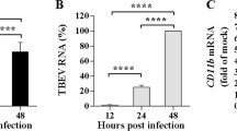 West Nile virus Kunjin strain was obtained from the full-length cDNA clone as described previously [106]. Virus was then amplified in Vero cells and titres were determined by plaque-assay in BHK-21 cells: serial dilutions of culture fluids were prepared, and 200 μl of each dilution was used to infect BHK-21 cells grown in 6-well plates, followed by incubation for 2 h and overlaying with DMEM supplemented with 0.5% low-melting-point agarose (Rio-Rad, USA) and 2% FBS. At 72 h after infection, cells were fixed with 4% formaldehyde in PBS and stained with 0.2% crystal violet solution. Plaques were then counted, and titres were calculated based on the dilution factor and infected volume.