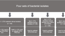 Samples were frozen at − 80 °C as aliquots homogenised in 0.9% sterile saline with 10% glycerol within an hour of receipt in the laboratory. For this study, faecal samples were thawed, and aliquots diluted 1:10 in saline and incubated for 16 h at 37 °C on Orientation CHROMagar (BD, Oxford, United Kingdom) with 10 μg cefpodoxime and 10 μg imipenem discs (Oxoid, Basingstoke, United Kingdom). For each faecal sample, up to three pink and/or dark blue colonies with different colonial morphotypes that grew within the cefpodoxime zone of inhibition (presumed ESC-R-EC and ESC-R-KP respectively) were selected for further analysis. Each selected colony was tested using the British Society of Antimicrobial Chemotherapy (BSAC) combination disc method to identify whether cefpodoxime (ESC) resistance was mediated via ESBLs (Class A: cefpodoxime-resistant, and cefpodoxime+clavulanic acid-sensitive) or via non-ESBL mechanisms (e.g. Class C AmpC beta-lactamases: cefpodoxime-resistant, and cefpodoxime+clavulanic acid-resistant) [31]. All identified ESC-R colonies were stored frozen at − 80 °C in nutrient broth with 10% glycerol. Carbapenem susceptibility testing was performed via BD Phoenix automated susceptibility testing (microbroth dilution method; Becton Dickinson, Franklin Lakes, NJ, USA).