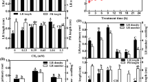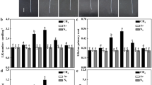 Tomato (Solanum lycopersicum L.) seeds “baiguoqiangfeng” were surface-sterilized in 2% sodium hypochlorite for 6 min, rinsed extensively and germinated in distilled water at 25 ± 1 °C in the dark for 3 days. Afterwards, the selected identical seedlings with radicles 2–3 mm were transferred to 4 ml treatment solutions containing the indicated chemicals and grown in an illuminating incubator (25 ± 1 °C) with a light intensity of 200 μmol m−2 s−1 at 14/10 h (light/dark) photoperiod.