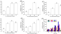 For detecting H2O2, the leaves were immersed overnight in a solution of DAB (1 mg mL− 1, pH 3.8). Thereafter, chlorophyll was removed by boiling in ethanol for 10 min and the reddish-brown coloration denoting the H2O2 content was visualized and photographed.