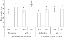 All Arabidopsis thaliana wild-type and transgenic lines were Columbia-0 ecotype. Seeds were sterilized in 70% (v/v) ethanol and 0.05% (v/v) Triton X-100 and then planted on 10 cm-diameter sterile plates containing complete nutrient medium [1.75 mM KCl, 2 mM Ca(NO3)2, 0.5 mM phosphoric acid, 0.75 mM MgSO4, 50 μM H3BO3, 10 μM MnCl, 2 μM ZnSO4, 1.5 μM CuSO4, 0.075 μM NH4Mo7O24, 74 μM Fe-EDTA, pH 5.6 with Ca(OH)2], 2% sucrose, and 0.8% SeaKem agarose (Cambrex). This complete nutrient medium was used throughout the study unless otherwise stated. After stratification of the seeds at 4 °C for 2~ 3 days, the plates were transferred to the growth chamber at 22 °C with a 16 h daylength at 200 μmol·m− 2 s− 1. Seedlings were grown on vertically oriented plates. Four- to 10-day-old seedlings were used throughout the study. For nitrate-deficient (-N) medium, 2 mM Ca(NO3)2 was replaced with 2 mM CaCl2.
