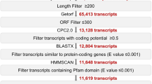 According to the characteristics of lncRNA, we adopted the following steps to identify lncRNAs from the transcripts of transcriptome assemblies [58]. First, all the transcripts that overlapped with reference genome were defined as “known lncRNA”. Second, among the remaining transcripts, those with length longer than 200 bp were selected for the protein-coding-score test to calculating the Coding Potential Calculator (CPC) [18] and Coding-Non-Coding Index (CNCI) [19]. Finally, the transcripts with CPC score < − 1 and CNCI score < 0 were defined as novel lncRNAs.