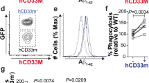 Late onset Alzheimer’s disease (LOAD) arises from a complex interplay between genetic and environmental factors. Genome-wide association studies (GWAS) suggest that approximately 70% of Alzheimer’s disease (AD) risk is attributable to genetic factors [1, 2]. Elucidating the functional aspects of identified genetic factors can facilitate our understanding of the underlying mechanisms contributing to disease pathogenesis. Human genetics, along with mouse models, cumulatively point to immune cells in the brain, called microglia, as being critical in AD pathogenesis through numerous functions, including their ability to phagocytose amyloid beta (Aβ) [3,4,5,6,7]. Of the numerous genes identified by GWAS that are linked to AD risk, a single nucleotide polymorphism (SNP) in the CD33 gene is one of the top ranked susceptibility loci [8, 9]. In fact, among the top ten AD risk genes conferring small effects, CD33 was the only one that showed significant effects in combination with APOE ε4 allele, suggesting that the impact of CD33 on AD susceptibility can be more profound when combined with other major risk factors [10]. CD33 is a member of the immunomodulatory sialic acid-binding immunoglobulin-type lectin (Siglec) family that is expressed on myeloid cells. In the brain, CD33 is predominantly expressed by microglia and its immunoregulatory roles are of great interest in the context of AD pathogenesis [11, 12].