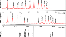 Supernatants of all incubations were subjected to an Accela reversed-phase high-performance liquid chromatography (RP-UHPLC) system coupled to electron spray ionization mass spectrometry (Thermo Scientific, San Jose, CA, USA). Injected samples (5 μL) were separated using an Acquity C18 column (2.1 × 150 mm, 1.7 μm particle size) with an Acquity UHPLC Shield RP18 Vanguard guard column (2.1 × 5 mm, 1.7 μm particle size). Both columns were purchased from Waters (Milford, MA, USA). Gradient elution with eluent A (H2O + 1% (v/v) acetonitrile + 0.1% (v/v) HOAc) and eluent B (acetonitrile + 0.1% (v/v) HOAc) was performed according to the following steps: From 0 to 17.7 min a linear gradient from 5 to 60% B; from 17.7 to 21.7 min, isocratic 100% B, and from 21.7 to 26 min, isocratic 5% B. The flow rate and the injection volume were 0.4 mL min−1 and 5 μL, respectively. The column temperature was set to 30 °C and the photodiode array detector was operated in the range of 200–400 nm.