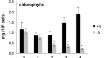 Removal of N resulted in cessation of cell doubling after approximately 2 days of starvation, while biomass concentrations continuously increased from initially 0.236 ± 0.024 g L−1 SE (standard error, n = 3) to 1.583 ± 0.06 g L−1 SE after 11 days of −N conditions. Increasing biomass concentrations and cessation of cell doubling indicate storage compound accumulation and translated into an increase in cell weight (Fig. 2a).