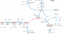 n-Butyraldehyde is an intermediate in the Clostridium CoA-dependent n-butanol production pathway [9, 13, 14] (Fig. 1b). However, bifunctional aldehyde/alcohol dehydrogenase AdhE2 catalyzes the direct two-step conversion of butyryl-CoA to n-butanol, bypassing n-butyraldehyde as a product. To avoid conversion of n-butyraldehyde to n-butanol, we first replaced AdhE2 with CoA-acylating aldehyde dehydrogenase (Aldh), catalyzing only the conversion of butyryl-CoA to n-butyraldehyde. Some Clostridia such as Clostridium beijerinckii contain individual Aldh and Adh instead of a bifunctional enzyme for butanol production. Alternatively, Aldh is found in the degradation pathways for ethanolamine and 1,3-propanediol [15, 16]. However, the Aldh from ethanolamine and 1,3-propanediol utilization operons are not specific for butyryl-CoA reduction and have been previously shown to produce ethanol when expressed in E. coli [17]. Therefore, for the present study, we chose to work with Clostridium Aldh. Based on the sequence of aldh from C. beijerinckii [18], we selected two additional homologues from C. saccharolyticum and C. saccharoperbutylacetonicum, as well as a mutant aldh from C. beijerinckii which we isolated previously in our lab (see Additional file 1 for its sequence). These four aldh genes were individually cloned into synthetic operons with the genes necessary to convert acetyl-CoA to butyryl-CoA (Fig. 1b). These synthetic operons were driven by native E. coli promoter of ack and adhE genes, Pack and PadhE, respectively, which have been previously shown to produce higher titers of butanol compared to using IPTG-inducible PLlacO1 promoter [19]. Here the Pack and PadhE were defined to include the ribosomal binding site and 5′ untranslated region upstream of their corresponding genes. atoB, aldh, crt, and hbd were cloned as one operon on a colE1 origin plasmid under the control of Pack. ter and fdh were individually expressed on colA and pSC101 origin plasmids, respectively, under the control of PadhE [19]. These plasmids were transformed into E. coli strain JCL299 which was previously shown to efficiently produce n-butanol and has ldhA, adhE, frdBC, and pta knocked out [9]. Having the mixed acid fermentation pathways knocked out, JCL299 efficiently channels acetyl-CoA and NADH for the synthesis of n-butyraldehyde. As expected, due to the presence of endogenous alcohol dehydrogenases, the resulting strains showed minimal production of n-butyraldehyde (Fig. 2a). Majority of the fermentation products was n-butanol across the strains expressing the four different aldh genes. Chromosomal yqhD, coding for NADPH-dependent alcohol dehydrogenase, is known to reduce aldehydes to their corresponding alcohols and highly active as a detoxification mechanism [20,21,22]. Therefore, we knocked out yqhD in JCL299, yielding strain ELeco1. Expressing the n-butyraldehyde pathway in strain ELeco1, n-butyraldehyde production was observed. The best strain ELeco1/pKU48/pRW18/pRW22 produced 0.16 g/L of n-butyraldehyde (Fig. 2b). However, the aldehyde-to-alcohol ratio was 0.39. This low aldehyde-to-alcohol ratio indicates the presence of other active native Adh capable of reducing n-butyraldehyde.