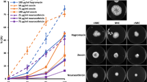 Since hyphal colonies of NCIM1228 do not easily mature and sporulate on SC agar, we used LMP agar (see “Methods” for details) to study colony structure of the two strains. LMP media permit sparse hyphal density with normal sporulation which enables easy observation of colony organization under microscope. When single spore of NCIM1228 was plated on LMP agar plate, it developed into a mature colony of diameter 68–75 mm in 10 days (Fig. 7a). The colonies of NCIM1228 displayed three well-grown mycelial layers with inner core, middle branched nodal mycelia and outer layer of invading mycelia of 12 mm in radius. In contrast, the colonies of PfMig188 strain appeared more compact and restricted with a diameter of 38–40 mm with reduced aerial growth (Fig. 7a). Out of the three layers of colony, outermost layer of invading hyphae was the most affected in PfMig188 having reduced width of 1–2 mm. For microscopic examination, mature colonies were stained with lactophenol blue and transverse sections of the colonies were observed under microscope. We identified stark difference in colony organization of the two strains. In case of NCIM1228, the colonies were organized into neat parallel bundles of unbranched hyphae which radiated out from the core and ended at the periphery of the colony (Fig. 7b–d). On the other hand, the PfMig188 colonies showed incongruous growth with shorter and fewer bundles of parallel hyphae which ended midway of the colony. The colonies showed disorganized growth of highly branched and short hyphae which probably gave roughness to the colony surface (Fig. 7b–d). We next determined the branching pattern of terminal hyphae of the two strains. For this, up to 140 and 100 µm terminal hyphal lengths of NCIM1228 and PfMig188, respectively, were considered. We found 70% of the total hyphae counted in NCIM1228 were unbranched, whereas only 8.8% of the hyphae of PfMig188 were unbranched (Fig. 7e and Table 1). Most of the branching in NCIM1228 was in the form of nicked bifurcation where the branch did not grow into complete hyphae, whereas 50% of the terminal hyphae in PfMig188 showed bifurcated branching where both the branches grew equally well. More than two branches were found in 30% of the terminal hyphae in PfMig188, whereas it was a rare sight in NCIM1228 (Table 1). This showed that hyphal development got affected upon deletion of PfMig1. The absence of Mig1 led to branching in terminal hyphae, thereby hindering their invading capacity. However, it might enhance enzyme secretion as secretion occurs only at the hyphal tip and more hyphal tips might lead to more enzyme secretion.