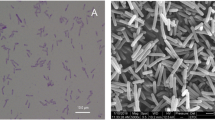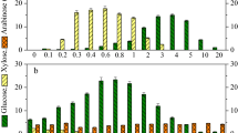 Fermentations were also carried out with cells immobilized in a fibrous-bed bioreactor (FBB) following the procedures described previously [13]. The FBB was made of a glass column packed with a spirally wound cotton towel (18 × 30 cm, ~ 0.5 cm in thickness, 95% porosity) overlaid with a stainless steel mesh. The FBB was connected to a 5-L stirred-tank fermentor with a recirculation pump, and the bioreactor system was operated with a total liquid volume of 2 L at 37 °C, agitated at 150 rpm, and pH controlled at 6.0 with 30% NH3·H2O via an auto-sensing and dosing system. Before use, the bioreactor containing the medium was sterilized by autoclaving at 121 °C for 30 min, and then flushed with N2 for about 30 min. To start the fermentation, the fermentor was inoculated with 100 mL cells cultured in serum bottles and allowed to grow to reach a cell density of ~ 4.0 g L−1. The medium was then recirculated between the fermentor and the FBB at a low flow rate for cell immobilization in the fibrous bed. After ~ 2 days when most of the cells had been immobilized, the fermentation broth in the fermentor was removed and replaced with fresh medium for fermentation kinetics studies. The fermentation was first studied with glucose, xylose, and the mixture of glucose and xylose (1:1, w/w), respectively, as carbon sources in the fed-batch mode by pulse feeding a concentrated sugar solution when sugars were almost depleted in the fermentation broth. The pulse feeding was repeated until the fermentation stopped producing butyric acid because of product inhibition. Repeated batch fermentations with corn husk hydrolysate were then studied to evaluate the kinetics and possible effects of hydrolysate inhibitors on long-term process performance. Samples were taken every 4 h for analyses of cell density, glucose, xylose, butyric acid, and acetic acid.