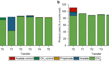 where n(i) is the number of moles of compound i, and \(n_{{e^{ - } {\text{H}}_{2} }}\), \(n_{{e^{ - } {\text{CO}}}}\) and \(n_{{{\text{e-Acetate}} }}\) are the number of e-mol per mol of H2, CO and acetate, respectively. Acetate was included as substrate in the calculations only for enrichments and fermentations with initial addition of acetate that resulted in net consumption of acetate.