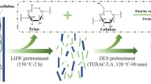 X-ray diffraction patterns of untreated and pretreated sugarcane bagasse were recorded with a Bruker D8-ADVANCE (Karlsruhe, Germany) with Cu radiation (1.542 Å) in the range from 5° to 60°. The crystalline index (CrI) and cellulose crystallites size (D) were calculated based on the Segal method [40] and Scherrer equation [41], respectively. SEM images (×2000) of untreated and pretreated sugarcane bagasse were obtained using an EVO18 (ZEISS, Germany). TG analyses of untreated and pretreated samples were conducted using TG-Q500 (TA instruments, USA). About 5–8 mg samples were heated from room temperature to 700 °C at a rate of 1 °C/min in a nitrogen environment (60 mL/min).