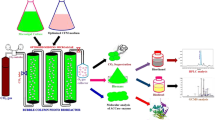 20 mL aliquot of the culture broth was centrifuged (4700 rpm, 5 min), the pellet was resuspended in saline (0.9% NaCl). and centrifuged (4700 rpm, 5 min) again. The supernatant was discarded and the pellet was freeze dried (− 30 °C, 0.370 mbar). Sample preparation for the quantitative and qualitative gas chromatographic analysis was done in a one-step-procedure of direct esterification coupled with extraction. A portion (20 mg) of freeze-dried biomass was weighed into a 15 mL glass Falcon with Teflon cap. 1.5 mL of hexane and 0.5 mL of 2.0 mg/mL internal standard (methyl benzoate dissolved in hexane) were added as solvent for lipid extraction. In addition, 2 mL 15% H2SO4 in methanol was added for esterification. Then, the sample was heated up to 100 °C for 2 h with continuous shaking. After cooling on ice, 1 mL demineralized water was added, and the mixture was centrifuged for 5 min with 2500 rpm at 4 °C. Afterward, 1 μL of the upper phase was analyzed via chromatography (Agilent Technologies, 6890 N Network GC-System). The instrument was equipped with a DBWax column (Length: 30 m, diam: 0.25 mm, film: 0.25 μm; Agilent Technologies Deutschland GmbH, Böblingen, Germany; 122-7032) and a flame ionization detector and worked with a pressure of 1.083 bar and initial temperature of 40 °C. The column temperature was increased from 40 to 250 °C at a rate of 8 °C/min. The temperature was held at 250 °C for 10 min before cooling down to 40 °C. The total fatty acid content and the identification of fatty acids were obtained using the standard RM3 FAME Mix (Sigma Aldrich, Taufkirchen, Germany; 07256-1AMP) and Marine FAME Mix (Acid Methyl Ester Marine Oil FAME Mix) (Restek GmbH, Bad Homburg, Germany; 35066). Fatty acids which represented less than 1% of total fatty acids were combined to “trace fatty acids”.