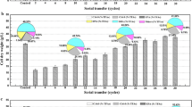 Cell density was determined by a UV-1750 spectrophotometer (Shimadzu, Japan) at OD660. For Nile Red analysis, 1.0 OD (OD660) cells were harvested, washed, and re-suspended in 1 mL of phosphate buffer saline (pH 7.2). After adding 10 μL Nile Red (10 mM), cells were incubated at 37 °C for 15 min and determined by a spectrophotometer (F-2700EL, HITACHI, Chiyoda, Japan). For total lipid content analysis, the method described previously was followed [29]. Briefly, total lipid of about 25.0 mg of lyophilized Schizochytrium algae powder was extracted by solutions containing chloroform: methanol (2:1, v/v) with 0.01% butylated hydroxytoluene for three times. The extracts were then washed with 1.0 mL of solution containing 1.0 M KCl for once, and with double-distilled water. The solvents were removed using a vacuum concentrator system (ZLS-1, Hunan, China). Fatty acid profile analysis was conducted following the method described previously [29]. Briefly, approximately 25 mg of lyophilized Schizochytrium algae powder was re-suspended in solutions containing 2 mL of methanol with 3% sulfuric acid and 2 mL of chloroform. The solutions were heated at 98 °C for 2 h. After cooling, 1 mL of distilled water was added and vortexed for 20 s. GC–MS experiments were performed using an Agilent 5975 MSD/7890 instrument (Agilent Corp, Santa Clara, CA, USA). The column was an HP-5MS (30 m × 0.25 mm × 0.25 μm film; Restek, Bellefonte, PA, USA). Ultra high purity helium was used as the carrier gas in a constant flow mode of 1 mL/min, and 1 μL of a given sample was injected in 1:2 split ratio mode. The temperature was kept at 80 °C for 2 min, and increased to 250 °C at a rate of 10 °C/min. When it reached 250 °C, the heating rate was decreased to 5 °C/min until 300 °C. The temperature was hold at 300 °C for 10 min before the analysis was terminated. NIST 11 mass spectral library (NIST/EPA/NIH mass spectral library, 2011 edition) was used for identified fatty acid methyl esters. The NADPH content was measured using Coenzyme II NADP(H) content determination kit (Nanjing Jiancheng Bioengineering Institute, Nanjing, China). Briefly, 7.5 OD of cells were harvested at 48 or 72 h, added with 1 mL of alkaline extract solution, and disrupted by cell disrupt apparatus. The solution was centrifuged at 14,000×g for 1 h. Five hundred microliters of supernatant was extracted and added with 500 μL of acid extract solution. The solution was centrifuged at 14,000×g for 10 min, and the supernatant extracted for NADPH content determination. The reaction agents were prepared according to the manufacture’s protocol. Distilled water was used as control. The absorbance wavelength was set at 570 nm. The equation for calculating NADPH content was: NADPH content (nmol/OD) = 0.0288 × (ΔA(sample−control) − 0.072).