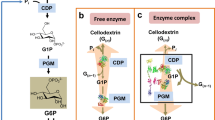 For enzymatic parameter measurements, the enzymes were incubated with substrates (Megazyme) in 50 mM phosphate buffer (pH 7) containing 0.01% (w/v) NaN3 at 37 °C (for detailed information, see Additional file 7). Then, 200 µL of sample was mixed with 50 µL of 0.5 M sodium hydroxide were added prior to analyses by High-Pressure Anion Exchange Chromatography coupled with Pulsed Amperometric Detection (HPAEC-PAD). 25 µL were applied to a Dionex CarboPac PA1 column (4 × 250 mm) and the corresponding guard column (4 × 50 mm) at 30 °C. Sugars were eluted using solutions A (0.1 M NaOH) and B (0.5 M sodium acetate, 0.1 M NaOH). For glucose, α-d-glucose-1-phosphate, and cellodextrins quantifications, the following multi-step procedure was used: isocratic separation (5 min, 95% A + 5% B), separation gradient (8 min, 10 to 37% B), column wash (2 min, 99% B), and subsequent column equilibration (2.5 min, 95% A + 5% B). The flow rate was kept at 1 mL min−1 in all cases. Injection of samples containing glucose, α-d-glucose-1-phosphate, cellobiose, cellotriose, cellotetraose, and cellopentaose at known concentrations (ranging from 4 to 100 µM) was used to identify and quantify the released sugars. Calculation of kcat and Km is based on Lineweaver–Burk method.