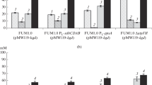 To further improve fumarate production, intracellular metabolites were analyzed for strains E. coli W3110△4-0 and E. coli W3110△4-P(H)CAI(H)S. The concentration of intracellular fumarate in strain E. coli W3110△4-P(H)CAI(H)S was increased by 128.6% compared with that of E. coli W3110△4-0 (Fig. 4b). Additionally, strain E. coli W3110△4-P(H)CAI(H)S showed a 21.2% increase in DCW compared with that of strain E. coli W3110△4-PCAIS (Fig. 2b). These results showed that the pyruvate flux was channelled not only to fumarate, but also to the TCA cycle, indicating that fumarate export probably needs to be engineered to transport fumarate more quickly.