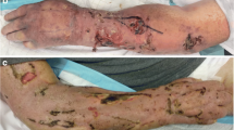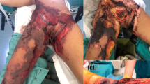 The key to successful management of patients with necrotizing soft tissue infections relies on early recognition, prompt and aggressive surgical debridement with targeted antibiotic therapy [3, 10, 14]. Early diagnosis of NF remains a challenge partly due to nonspecific skin findings causing it to be misdiagnosed as cellulitis [2, 5, 14]. This patient was initially managed as cellulitis prior to referral, and this delayed the diagnosis of NF. Such delays in recognition and treatment will result in greater soft tissue lost and increased risk of morbidity and mortality [5, 14]. Early clinical differentiation between NF and cellulitis is important for early surgical management. Kobayashi et al. showed that delays in surgical treatment of > 12 h are associated with an increased number of surgical debridement, higher incidence of septic shock and acute kidney injuries in patients with necrotizing soft tissue infections [15]. Unusual location of soft tissue infections, lack of associated co-morbidities and/or risks factors, absence of any history of preceding trauma or an obvious breech in the continuity of skin or mucosa, or a low Laboratory Risk Indicator for Necrotizing Fasciitis (LRINEC) score thus excludes the diagnosis of NF [2, 4]. Our patient presented no specific risk factors for NF and no history of initiating trauma or breech in skin continuity but however developed a life threating NF.