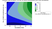 The contour plots and response surface plots were used for predicting enhanced production by anticipating the optimal values of different variables. According to the analysis of results obtained, it can be speculated that pretreatment with 0.5% NaOH and moistening agent 2 (MSM + YE) can be used to get more titers of EG (Fig. 1a, b). Additional file 1: Fig. S1a, b presents that 0.5% NaOH-pretreated substrate with moistening agent’s pH 6.7 is the best combination for EG production. This finding was in agreement with Rahnama et al. (2013), where 0.5% alkali-pretreated substrate was found a better substrate for cellulase and xylanase production by Trichoderma harzianum SNRS3 under SSF. Neutral pH was reported as optimal pH by Hmad et al. (2014) for the production of cellulase from filamentous fungus Stachybotrys microspora (mutant strain A19). The analysis of data revealed that there was an enhanced production of EG with an increase in the incubation time and 0.5% NaOH-pretreated substrate (Fig. 1c); however, a decline in EG production was observed upon further increase in NaOH (see Additional file 1: Fig. S1c). This can be explained as enzyme production reaches to maximum in log phase of the growth, and this finding was in agreement by Rosyida et al. (2015).