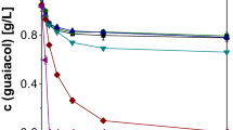 In Table 3, modelling parameters of the integrated CO2 evolution data are presented. The \([{\text{CO}}_{{2_{\text{max} } }} ]\) values confirmed the influence of the initial moisture content arrangement. For example, it can be seen that CO2 evolution was lower on wheat bran when the initial moisture content was set up at 15% for both fungi (Exp. 4[AA] and Exp. 4[AO]). In Exp 1[AA] with A. awamori (initial moisture content from low to high), greatly enhanced evolution of CO2 was observed. However, in Exp. 3[AO] with A. oryzae (initial moisture content at 65% in every tray), there was observed among the highest evolution of CO2. The evolution rate (k) values were variable, with all being in the range 0.038–0.063 h−1 and 0.043–0.073 h−1 for A. awamori and A. oryzae, respectively, though a clear tendency can be seen in relation to the initial moisture content arrangement. There is still no apparent relationship between this parameter and the amount of CO2 evolved characterised by [\(CO_{{2_{max} }}\)]. The calculated tmax values were close to those obtained experimentally. These values were in the range of 30.5–43.2 h and 24.9–30.7 h for A. awamori and A. oryzae, respectively, and seem to be very strongly influenced by the studies carried out. The same observation was recorded with \(b\) values.