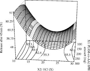 The purpose of this study was to formulate a superporous hydrogel (SPH) containing carvedilol self-nanoemulsifying drug delivery system. Effects of formulation parameters (amount of SPH and 0.1 N HCl used during drug loading) were studied in 32 factorial design. Response surface plots showed significant effect of the parameters on hydrogel swelling, carvedilol content, and carvedilol in vitro release. Regression equations were generated to calculate the desirable responses.