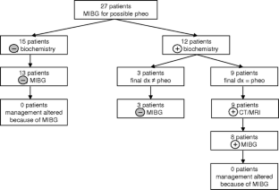 A total of 60 patients received MIBG, including 27 patients for the evaluation of a possible pheochromocytoma. Biochemical testing was performed in all patients. Fourteen patients received MIBG despite normal biochemistry and an absence of risk factors such as a hereditary syndrome or prior history of pheochromocytoma. None of these 14 low-risk patients with negative biochemistry had a final diagnosis of pheochromocytoma. In the ten patients with pheochromocytoma, all tumors were localized by CT and/or MRI. Importantly, MIBG did not identify any foci of disease not seen on cross sectional imaging, and MIBG did not alter the surgical management of any patient in this series.