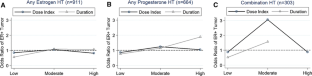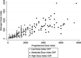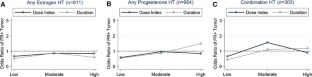 The cumulative effect of estrogen and progesterone hormone therapy as calculated by factoring both dose and duration of HT use prior to breast cancer diagnosis did not reveal any new associations that were not previously identified by analysis of HT duration of exposure alone. Low-dose-index combination-HT users were less likely to have tumors with an ER-positive phenotype. An overall trend developed in which low- and high-dose-index exposed women had the lowest rates of ER- and progesterone receptor (PR) -positive tumors.