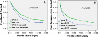 DPHCC accounted for 10.1% (n = 155) of total HCCs. The serum alfa-fetoprotein and CA19-9 were elevated in 87.7% (n = 136) and 20.7% (n = 32) of patients, respectively; the former had close correlation with the immunostaining of CK19 (P < 0.01). The combination of immunostaining intensities of CK19 and MUC-1 was significantly associated with tumor size, microvascular invasion, and satellite nodule formation (P < 0.05–0.01). Compared to patients with pure HCC, those with DPHCC had significantly lower overall survival (30.4 ± 3.7 vs. 43.6 ± 3.9 months, P < 0.05) and recurrence-free survival (13.2 ± 2.0 vs. 23.4 ± 2.5 months, P < 0.01), respectively. Multivariate Cox regression analyses identified CK19-positive expression to be an independent prognostic factor for both overall survival and recurrence-free survival.