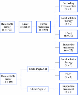 Included in this study were 113 patients who were histologically diagnosed as having Allen type C cHCC-CC, 103 of whom received liver resection, 6 transarterial chemoembolization treatment, 3 radiofrequency ablation, and 1 palliative supportive treatment. Clinicopathologic features and prognosis of 103 cHCC-CC patients after liver resection were compared with those of 6,679 patients with hepatocellular carcinoma (HCC) and 386 patients with intrahepatic cholangiocarcinoma (ICC) who underwent liver resection during the same period.