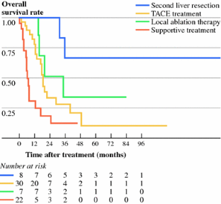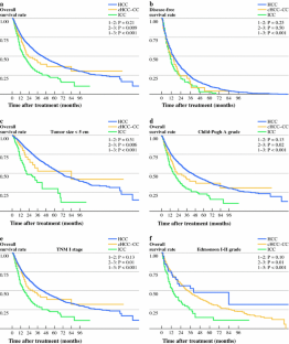 The proportion of cHCC-CC in primary liver cancers was 1.5 %. The 103 cases of cHCC-CC were characterized by male predominance, infection with hepatitis virus or presence of liver cirrhosis, and elevated alfa-fetoprotein—findings similar to HCC. However, serum CA19-9 elevation, incomplete capsules, and lymph node involvement were similar to ICC. The 1-, 3-, and 5-year overall survival rates after liver resection were 73.9, 41.4, and 36.4 %, respectively, for patients with cHCC-CC versus 77.5, 53.3, and 41.4 % for HCC patients, and 58.0, 29.1, and 22.3 % for ICC patients (χ2 = 137.5, P < 0.001). Tumor, node, metastasis system stage (hazard ratio 1.27, 95 % confidence interval 1.08–1.49, P = 0.003) and radical liver resection (hazard ratio 0.31, 95 % confidence interval 0.14–0.68, P = 0.004) were independent prognostic factors for overall survival.