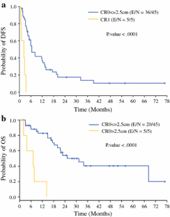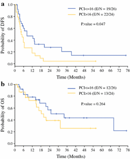 The median follow-up period for the surviving patients was 21.9 months. The most common diagnoses were desmoplastic small round cell tumor (n = 21), rhabdomyosarcoma (n = 7), mesothelioma (n = 4), and other carcinoma (n = 17). Multivariate analysis showed that patients treated with HIPEC and an incomplete cytoreduction had a greater risk for recurrence than those who had a complete cytoreduction (p = 0.0002). The patients with a higher peritoneal cancer index (PCI) (i.e., a large tumor burden) had a median overall survival (OS) time of 19.9 months relative to the patients with a lower PCI score, who had a median OS of 34 months (p = 0.049). The patients without complete cytoreduction had a median OS of 7.1 months compared with 31.4 months for the patients with complete cytoreduction (p = 0.012). No perioperative mortalities occurred. The incidence of major complications was 28 %.