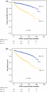 The mean preoperative PNI value was 52.7 ± 6.3 (range 27.7–85.3). The mean PNI values were significantly lower in patients with more advanced tumor T stage, regional lymph node metastasis, distant metastases, higher Fuhrman grade, and sarcomatoid differentiation than in patients without such factors (p < 0.001). Patients with low PNI (<51) had poor survival rates compared to those with high PNI in univariate analysis (>51, p < 0.001). Multivariate analysis showed that low PNI was significantly associated with cancer-specific survival (p = 0.026 and p = 0.009) and overall survival (p = 0.013 and p = 0.011) in the T1-4NallMall and T1-4N0M0 groups, respectively, after correcting for other clinicopathological factors.