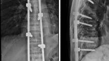 Median time from first surgical consultation to surgical intervention was 9 (range 0–377) days. The most commonly treated areas were the thoracolumbar (T10–L2, n = 39) and thoracic (n = 38) regions, followed by the lumbar (n = 22) and lumbosacral (L4–S2, n = 2) regions. The median operating time was 122 (range 57–325) minutes; median blood loss was 100 (range 50–500) ml based on data available for 41 patients. Five or more vertebral bodies were bridged in 65 patients (64 %), four in nine patients (9 %), and three in 27 patients (27 %). Vertebroplasty was performed in six patients (6 %), kyphoplasty in 10 patients (10 %), and vertebral body stenting in 19 patients (19 %). Cement augmentation of pedicle screws was performed in three patients (3 %).