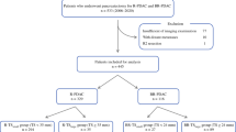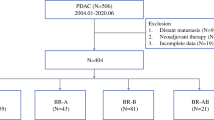 Patients were retrospectively assigned to four groups (BR-A, BR-B, BR-C, or R) according to ICC on the classification of BR-PDAC.16 This was done stepwise and prioritized according to anatomical criteria, i.e., patients with involvement of venous or arterial vessels were assigned to group BR-A, regardless of their CA19-9 levels. No combinations of different ICC dimensions were calculated (e.g., BR-AB). In detail, patients with a tumour contact of less than 180° to the superior mesenteric artery (SMA) or common hepatic artery (CHA) and/or a tumour contact of 180° or greater to the superior mesenteric vein (SMV) or portal vein (PV), bilateral venous narrowing, venous occlusion, or tumour growth exceeding the inferior border of the duodenum on the line of SMV in preoperative cross-sectional imaging were exclusively assigned to the BR-A group. Patients with preoperative CA19-9 serum levels that exceeded 500 U/ml and who had not been assigned to the BR-A group were allocated to the BR-B group. Preoperative positron emission and computed tomography (PET-CT) or endoscopic ultrasound to rule out potential regional lymph node metastasis had not been performed on a regular basis and were therefore not accounted for in the definition of BR-B patients. No patients with an Eastern Cooperative Oncology Group (ECOG) status of ≥ 2 underwent PD for PDAC at both hospitals. Consequently, no BR-C group was to be formed. All other patients’ tumours were staged primarily resectable (maximum vein abutment < 180°) and assigned to group R. The primary endpoint of this study was the difference in overall-(OS) and disease-free survival (DFS) between groups. Secondary endpoints were type of surgery, the incidence of postoperative complications according to the Clavien-Dindo-Score,19 length of hospital stay, and 30-day mortality. Additionally, the rate of preoperative bile drainage and differences in pathological reports were assessed and the numbers of patients who had undergone adjuvant chemotherapy were recorded.