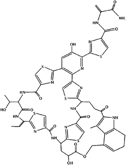 Nosiheptide is quite different from all the other members of this family. It is very active to inhibit infections caused by gram-positive bacteria, with the average maximum inhibitory concentration (MIC) of 8 ng mL−1. But for gram-negative bacteria, such as Escherichia coli, Shigella, Salmonella, Aerobacter, Proteus, Serratia, Pseudomonas, Brucella, Fusobacterium, MIC was more than 125,000 ng mL−1. Moreover, the anti-virus effect of nosiheptide has been reported recently [6, 7, 8, 9].