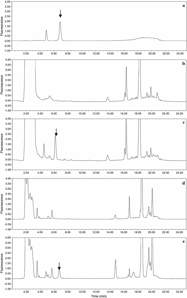 The LC system was equipped with a Waters 2475 fluorescence detector and a Waters 2695 separations module (Waters Co., Milford, MA, USA). The chromatographic column was a reversed-phase column (Inertsil ODS-3 columns, 4.6 mm i.d. × 250 mm, 5 μm, GL Sciences Inc. Tokyo, Japan). The injection volume was 20 μL. The column temperature was set at 30 °C. Excitation wavelength was at 357 nm, and emission wavelength was at 515 nm. The mobile phase consisted of solvent A (0.025% phosphoric acid aqueous solution) and solvent B (acetonitrile) and was run at a flow rate of 1.0 mL min−1 with a gradient program as follows: 60% B (0 min), 60–40% B (7 min), 40–100% B (3 min), 100% B (3 min), 100–40% B (1 min), 40% B (11 min).