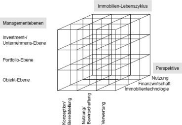 Auf jeder dieser Stufen lassen sich erneut die vorgenannten Perspektiven rund um die Immobilie einnehmen, das heißt, auch beim Immobilienmanagement existieren der nutzungsorientierte, der finanzwirtschaftliche und der immobilientechnologische Blickwinkel (Kämpf-Dern, 2009, S. 3), so dass ein dreidimensionales Gefüge entsteht (siehe Abb. 1). Der Würfel zeigt die unterschiedlichen Dimensionen der verschiedenen Ebenen des Immobilienmanagements. So bilden die verschiedenen Managementebenen die verschiedenen Phasen des Immobilien-Lebenszyklus ab und können aus den drei genannten Perspektiven des Nutzers, des Anlegers und des Immobilienentwicklers durchgeführt oder in Auftrag gegeben werden. Der Würfel veranschaulicht das in der Einleitung angesprochene Aufbrechen der Wertschöpfungskette im Immobilienmanagement. Die Immobilienmanagement-Aufgaben werden nicht mehr strikt parallel zu den verschiedenen Phasen des Lebenszyklus einer Immobilie definiert und gestaltet, sondern vielmehr modular verstanden.