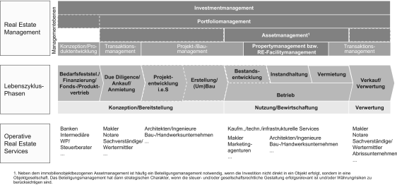 Während auf der höchsten Ebene, der Investmentebene, die Unternehmenspolitik in Bezug auf die immobilienwirtschaftlichen Aktivitäten festgelegt wird, werden auf der mittleren Ebene, der Portfolioebene, die strategischen Fragestellungen rund um das Portfolio verantwortet. Die unterste Ebene teilt sich in die strategische Objektebene einerseits und in die operative Objektebene andererseits. Das strategische Objektmanagement ist für die Umsetzung der Portfoliostrategie verantwortlich, indem es objektbezogene Strategien erstellt. Das operative Objektmanagement nimmt die operativen Managementaufgaben am Objekt wahr und steuert neben den eigenen Geschäftsprozessen auch die internen und externen Dienstleister (Kämpf-Dern u. Pfnür, 2009, S. 23f.).
