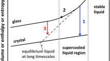 The kinetic study of undercooled liquids gained momentum owing to the nature of the undercooled liquids: high viscosity and fragility. High viscosity (high density) is due to different types of atom elements, which exhibit individual local order [53]. However, to study the kinetics of equilibrium liquids undergoing glass transition using advanced techniques, many considerations have to be made, including longer relaxation times of liquids and prevention of crystallization and chemical decomposition process. Low viscosity above the melting point and low apparent activation energy for flow are characteristics of kinetically fragile liquids. The activation energy for flow dramatically increases when the viscosity of fragile liquids approaches \(T_\text {g}\). At the melting point, strong liquids, such as silicates, have high melt viscosities that are up to eight orders of magnitude greater than those of fragile liquids [49].