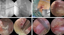 The patients were asked to lie on the operating table and all received local anesthesia. They were routinely informed about all PELD procedures. Communication between the surgeon and patients was maintained intraoperatively. Biplane fluoroscopy was used. Depending on the patient’s weight, gender, and surgical level, the entry point was selected 12–16 cm from the midline at the L5/S1 level, and 11–14 cm from the midline at the L4/5 level (Fig. 1).