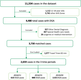 This retrospective, population-based study included all children (\(<\) 12 years of age) living in Calgary (non-fluoridated) and Edmonton (fluoridated) who underwent caries-related dental treatments under GA at publicly funded facilities. Demographics and dental data were extracted from health administrative databases for three time periods of 2010/11 (pre-cessation), 2014/15, and 2018/19 (post-cessation).
