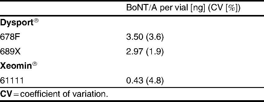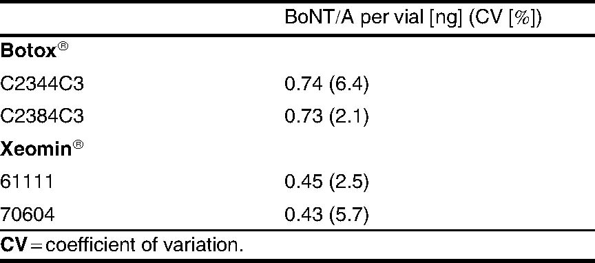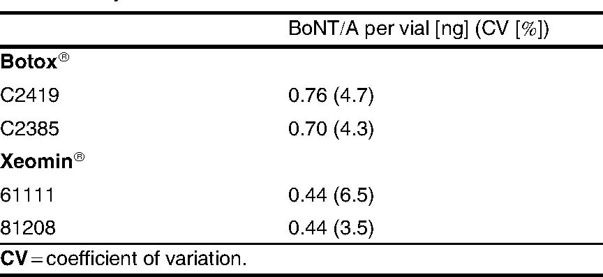 The concentration of BoNT/A in Botox®, Dysport®, and Xeomin® was reported using descriptive statistics. The coefficient of variation (CV) was calculated by dividing the standard deviation by the mean of all values, and is expressed as a percentage.