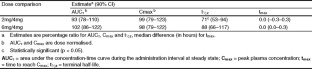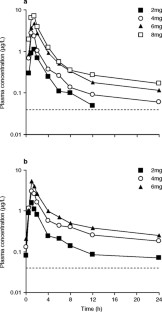 After repeated 2, 4 and 6mg doses of lacidipine, geometric least square mean values (95% CI) were 1.76 (1.46–2.12), 3.56 (2.96–4.29) and 5.23 (4.34–6.30) µg/L for Cmax and 5.29 (4.57–6.11), 11.42 (9.87–13.20) and 17.55 (15.18–20.29) µg · h/L for AUC over the administration interval at steady state (AUCτ), respectively. Mean half-life ranged between 13.2 hours and 18.7 hours. Precision of these estimates was limited by the small number of sampling timepoints collected in the final part of the curve. After administration of single doses, no statistically significant deviation from linearity was found except for the 8mg dose, but a trend of greater than proportional exposure was evident with increasing dose. Following repeated administration, dose linearity over the therapeutic range was observed. No statistically significant difference was observed between AUC to infinity (AUG∞) on day 1 and AUCτ on day 8, suggesting time-invariance of pharmacokinetics.